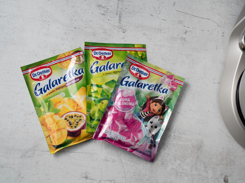 Wybierz ulubione kolory (i smaki!) galaretki. Ja zdecydowałam się na różowy (guma balonowa), żółty (mango - marakuja) i zielony (agrest).