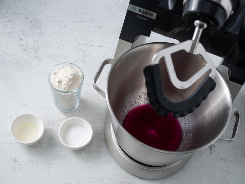 Dodaj mąkę, sól i olej i zagniataj na średnich obrotach przez około 2 minuty. Użyłam do tego końcówki miksera tzw. "motylka" (ta sama końcówka, co do ucierania ciasta).