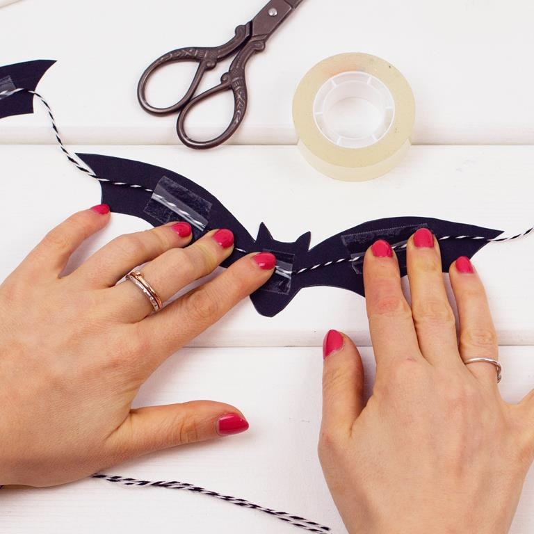 Przyklej nietoperze taśmą klejącą do sznureczka. Żeby nietoperze dobrze się trzymały, przyklej po kawałku taśmy na środku oraz na skrzydłach.