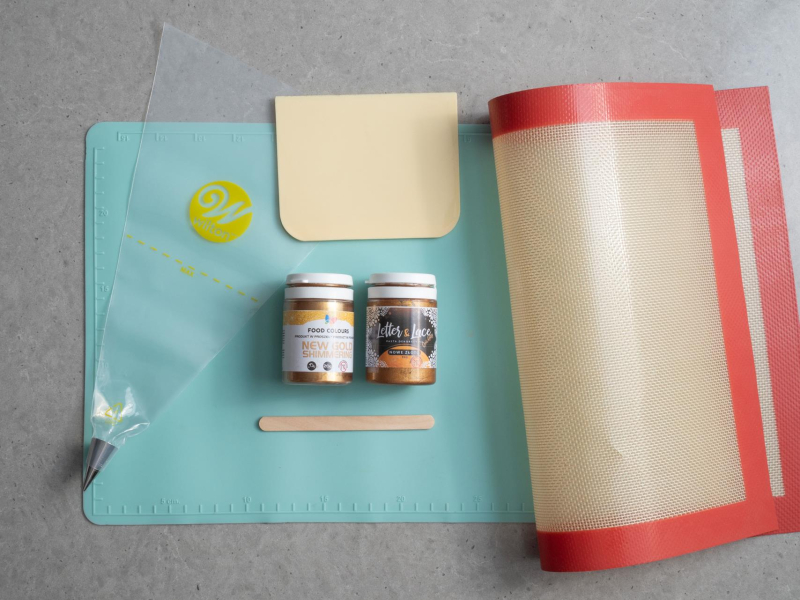 Przygotuj dwie maty silikonowe, packę cukierniczą, drewniany patyczek lub małą łyżeczką, rękaw cukierniczy z tylką z jak najmniejszym okrągłym zakonczeniem (ja użyłam Wilton nr 3), pastę dekoracyjną Letter & Lace oraz złoty barwnik w proszku.