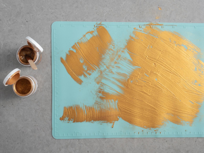 Drewnianym patyczkiem wyłóż niewielką ilość pasty na matę silikonową o gładkiej powierzchni. Za pomocą packi cukierniczej rozetrzyj ją na macie na bardzo cienką warstwę. Posyp obficie złotym barwnikiem w proszku, ponownie rozetrzyj, strzepując jego nadmiar. Odstaw do wyschnięcia na 24 godziny.