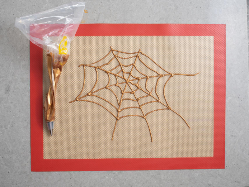 Na macie silikonowej (ja uzyłam perforowanej, ale nie ma to znaczenia dla powodzenia Waszej dekoracji) wyciskaj pastę, tworząc wzór pajęczyny.