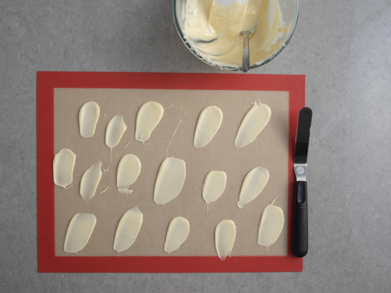 Odstaw na blat do wyschnięcia na około 8 godzin lub wstaw do piekarnika nagrzanego na 60°C i susz około 30 minut. Dekorację odstaw do całkowitego ostygnięcia i delikatnie odklej z maty.