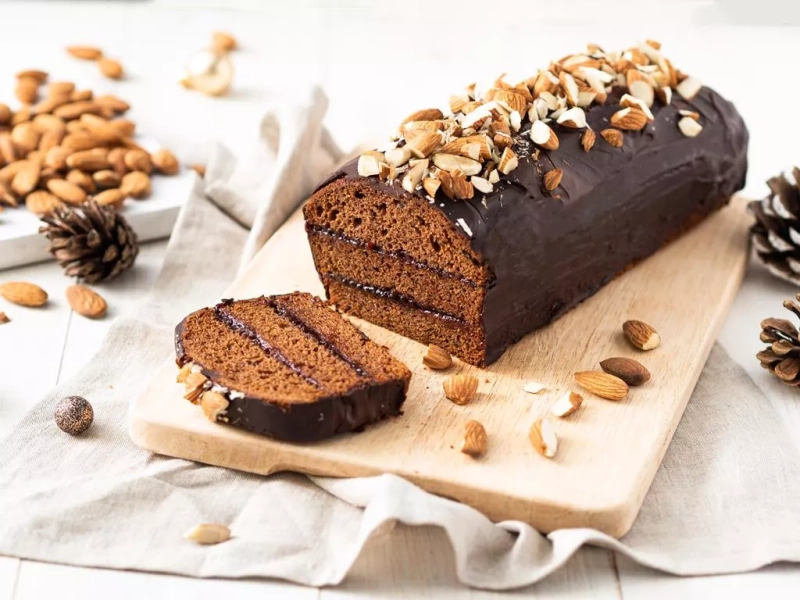 Wegański piernik będzie pięknie prezentować się na świątecznym stole obficie posypany siekanymi migdałami.