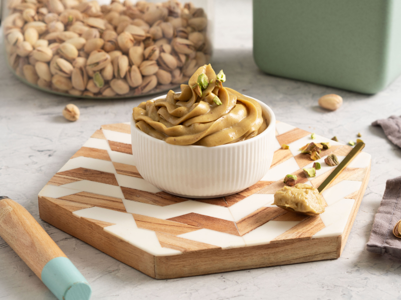 Krem pistacjowy do tortu jest lekki i zachowuje swój kształt 🧁Można go wykorzystać na wiele sposobów: jako przełożenie do ciast, tortów, a także jako smarowidło do croissantów czy naleśników. Może stanowić również pyszny element dekoracyjny w połączeniu z owocami lub czekoladą. Jeśli szukasz oryginalnej alternatywy dla klasycznych smaków, ten krem pistacjowy będzie strzałem w dziesiątkę!
