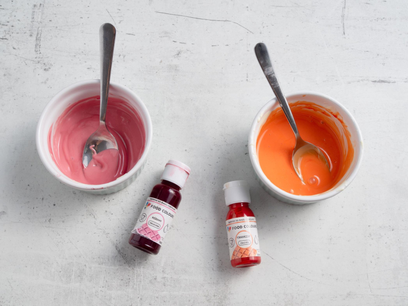 Podziel czekoladę na dwie porcje, do każdej dodaj barwniki do czekolady w wybranych kolorach. Ja korzystałam z barwników do czekolady i mas tłustych od Food Colours, w kolorze różowym i pomarańczowym.