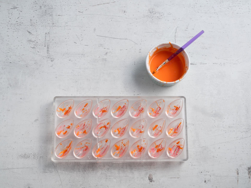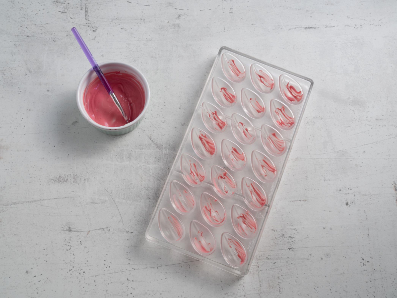 Maluj wnętrze foremki zabarwioną białą czekoladą – efekt WOW gwarantowany.