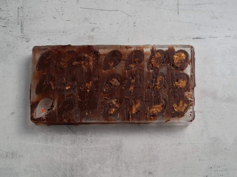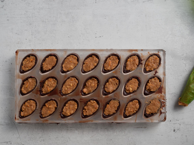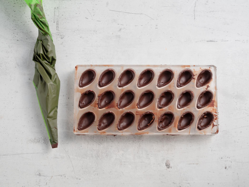 Pozostałą czekoladę ponownie rozpuść, uzupełnij dno czekoladek, nadmiar czekolady usuwając metalową szpachelką. Czekoladki odstaw do lodówki do całkowitego zastygnięcia (30-40 minut).