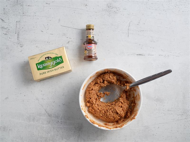 Precelki pokrusz na drobne kawałki, wymieszaj z masłem orzechowym, miękkim masłem, cukrem pudrem i ekstraktem. Masę przełóż do rękawa cukierniczego i odetnij końcówkę.