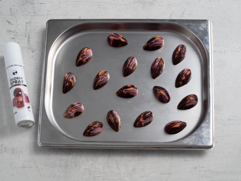 Schłodzoną formę odwróć do góry nogami i mocno uderz o stół - czekoladki same powinny wyjść z formy. Przełóż na tackę lub papier do pieczenia i spryskaj lakierem spożywczym Glossy Spray, aby czekoladki były jeszcze bardziej błyszczące i zabezpieczone przed wilgocią.