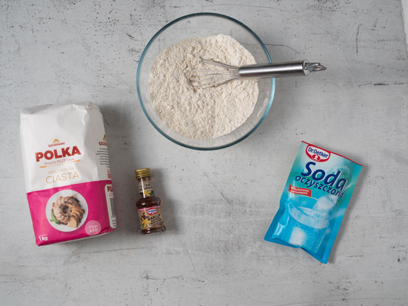 W misce wymieszaj mąkę z solą i sodą oczyszczoną.