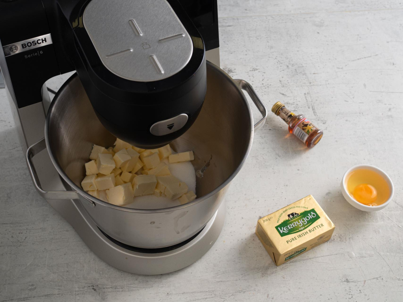 W misie miksera utrzyj miękkie masło z cukrem. Dodaj ekstrakt z wanilii, jajko oraz mleko. Ciasto będzie przypominać zwarzoną masę - dodaj suche składniki i krótko wymieszaj.