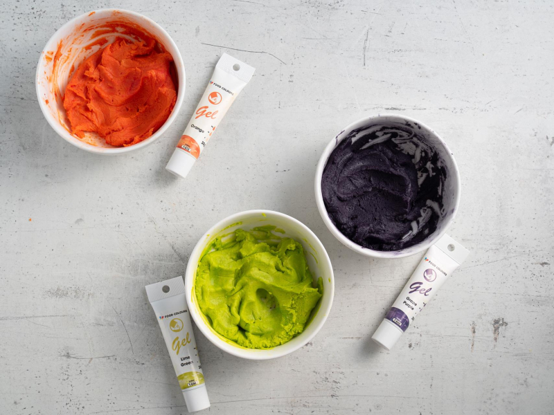 Gotowe ciasto podziel na 3 porcje. Do każdej z nich dodaj wybrany barwnik. Ja postawiłam na halloweenowe kolory i barwniki w żelu od Food Colours.
