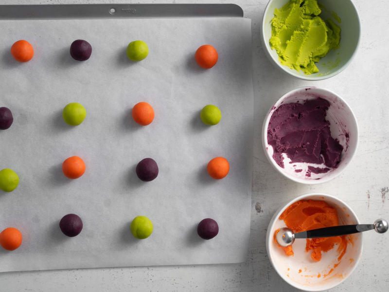 Każdą kulkę obtocz w cukrze pudrze i ułóż na blaszce wyłożonej papierem do pieczenia.