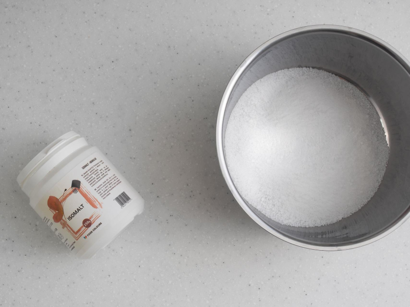 Izomalt, czyli substancja słodząca najczęściej w postaci białych granulek, w kilka minut po podgrzaniu zamienia się w klarowną ciecz. Po zastygnięciu otrzymamy np. cukrowe dekoracje, które pozostaną przejrzyste przez dłuższy czas.