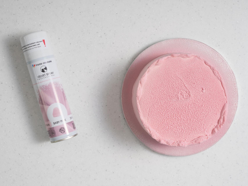 Zamsz w sprayu zanurz na 15 minut w gorącej wodzie. Wstrząśnij puszkę i równomiernie spryskaj zamszem mocno schłodzony tort.