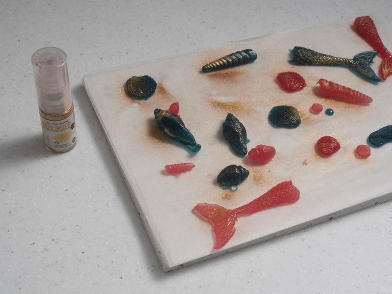 Ozdoby z izomaltu delikatnie wyjmij z foremek. Powinny z łatwością odchodzić od silikonu. Ułóż je na desce lub papierze do pieczenia i udekoruj złotym barwnikiem w sprayu.