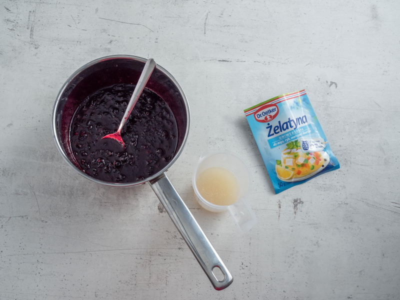 Porzeczki zagotuj z cukrem, odstaw do przestudzenia. Żelatynę namocz w wodzie, pozostaw do napęcznienia.
