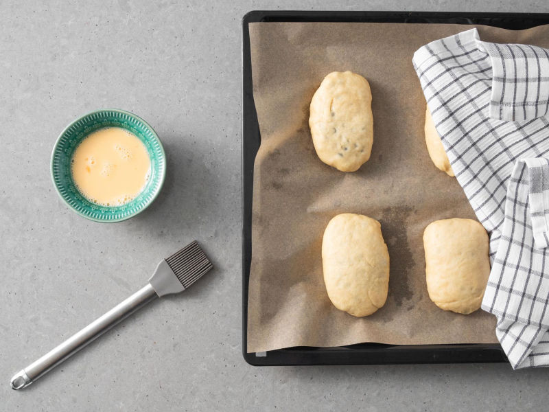 Zawinięte jagodzianki ułóż łączeniem do dołu na blasze wyłożonej papierem do pieczenia. Przykryj bułeczki bawełnianą ściereczką i odstaw do ponownego wyrastania na około 1h.