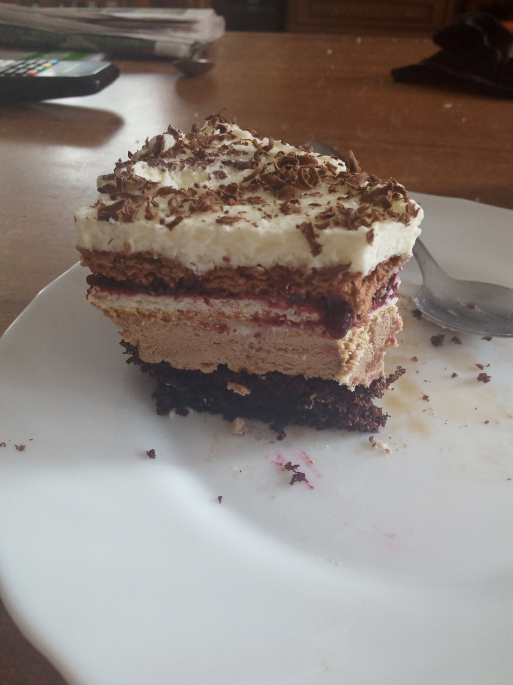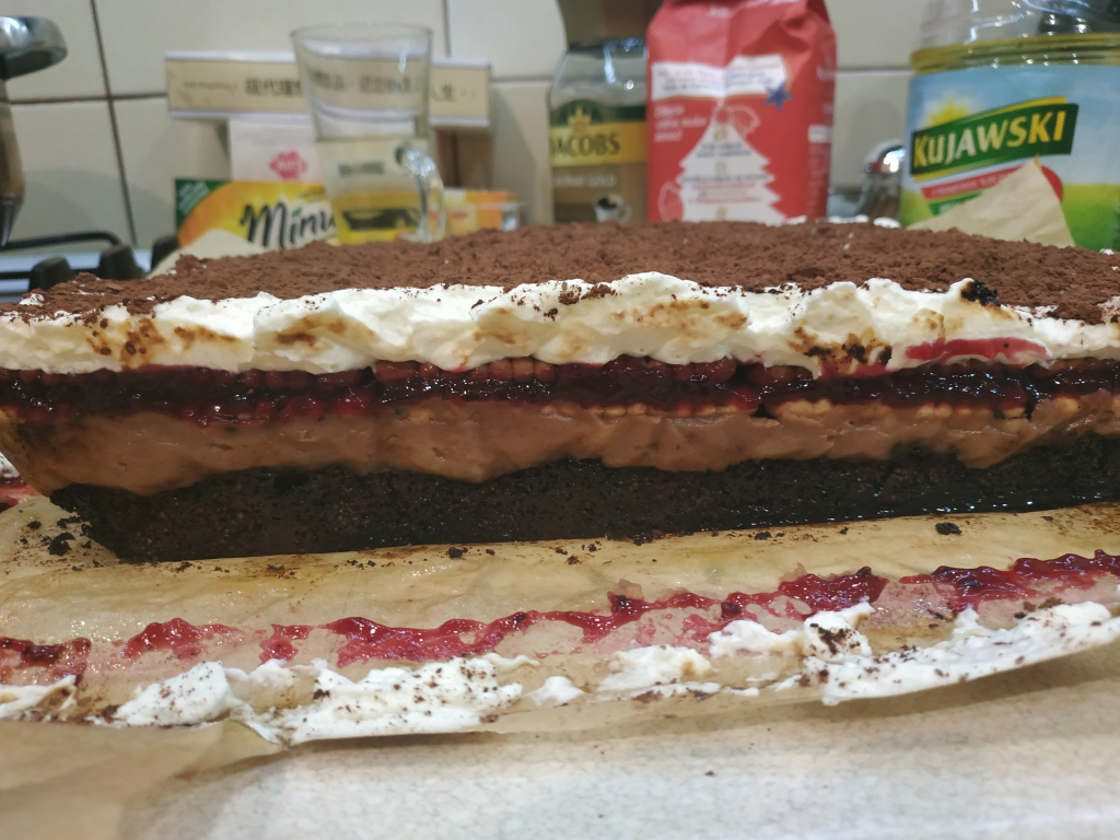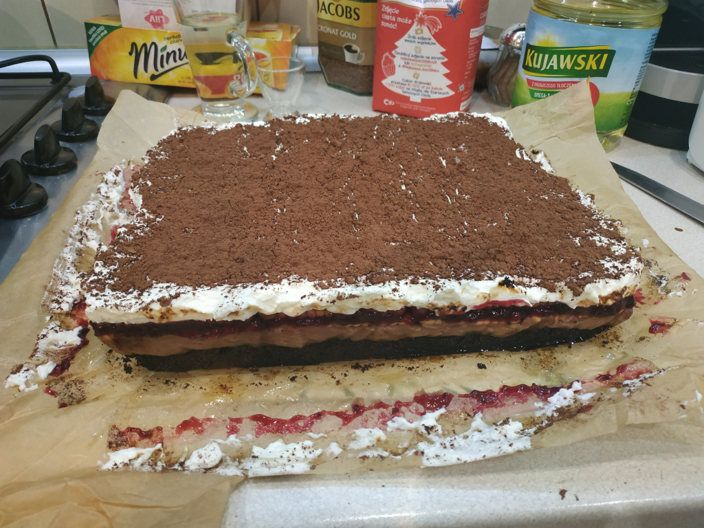 Ubitą kremówkę przełóż na wierzch ciasta. Wstaw na noc do lodówki.