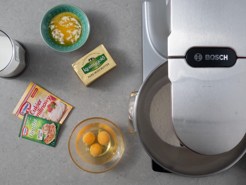 Dodaj ciepłe mleko, jajka, rozpuszczone i przestudzone masło. Zagniataj przez kilka minut do uzyskania gładkiego ciasta. Przykryj ściereczką i odstaw do wyrośnięcia.