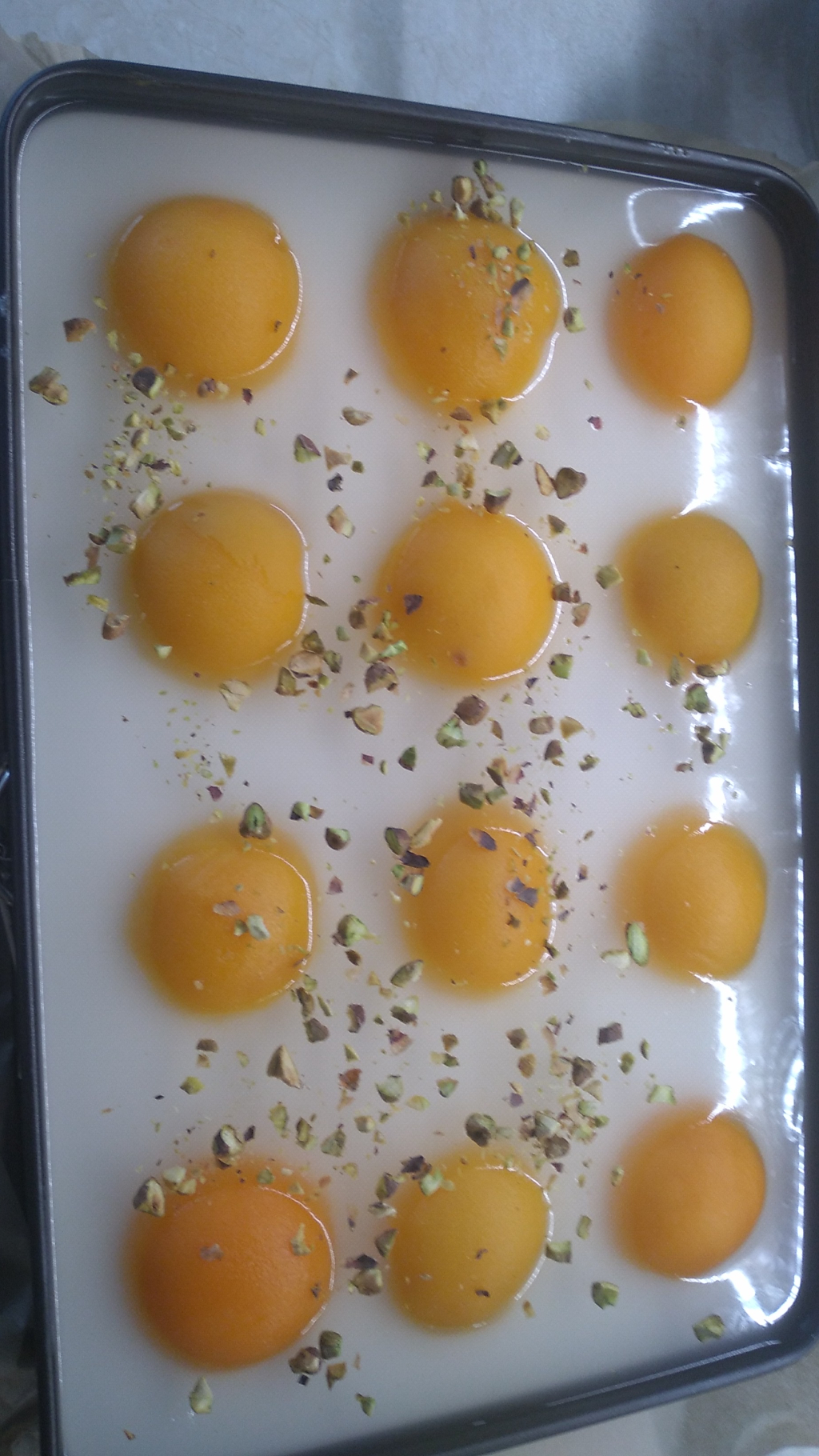 Brzoskwinie zalej tężejącą galaretką. Odstaw ciasto do lodówki na około 2 godziny.
