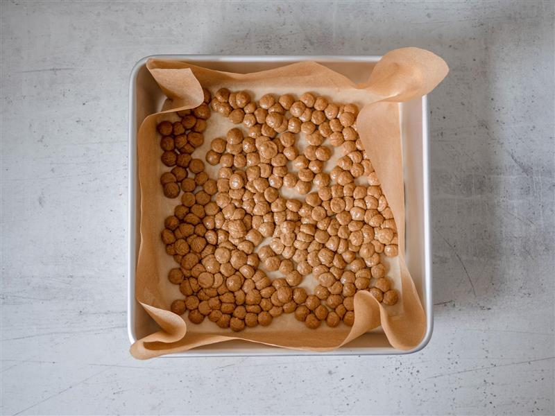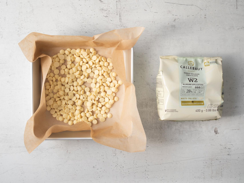 Białą czekoladę wysyp na blaszkę wyłożoną papierem do pieczenia. Wstaw do piekarnika nagrzanego na 140°C (góra-dół) i piecz około 10-15 minut, aż czekolada będzie miała złoty, karmelowy kolor.