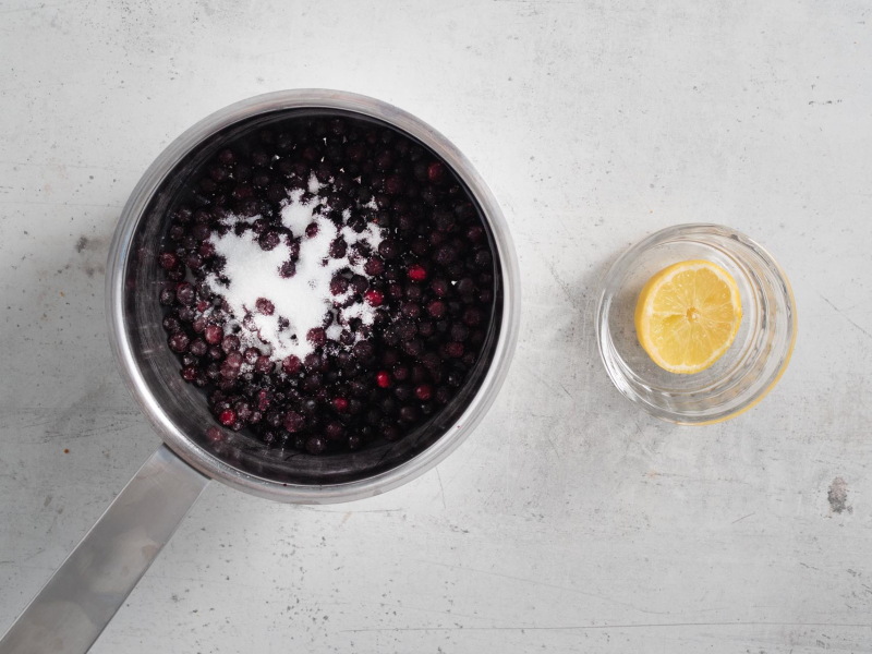 Jagody wymieszaj z cukrem i sokiem z cytryny. Zagotuj, do momentu, aż owoce się rozpadną.