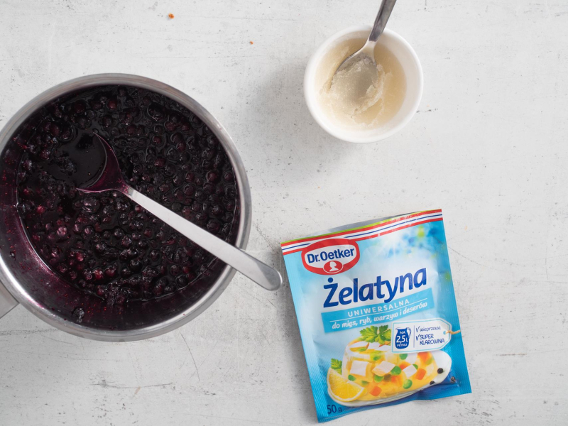 Żelatynę zalej zimną wodą i odstaw do napęcznienia. Następnie dodaj ją do gorących owoców i dokładnie wymieszaj.