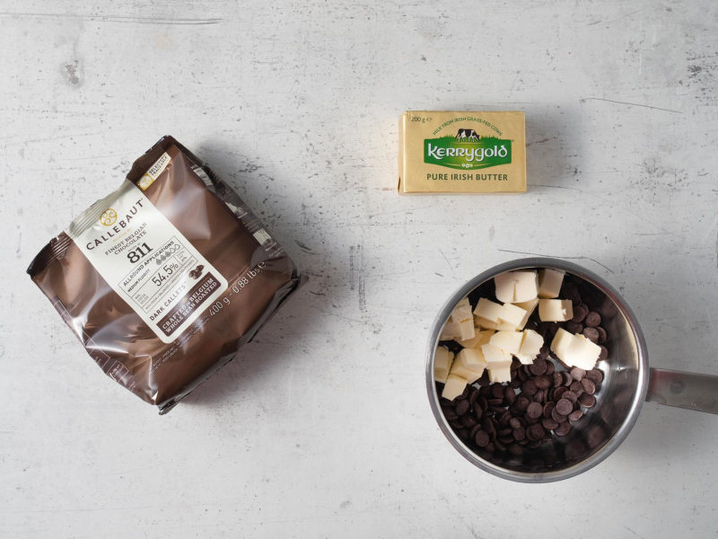 Czekoladę rozpuść w rondelku z masłem na gładką masę. Odstaw do przestudzenia.