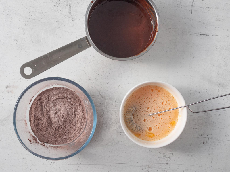 Do masy czekoladowej dodaj jajka lekko podbite z cukrem, a następnie wmieszaj suche składniki (mąkę + kakao).