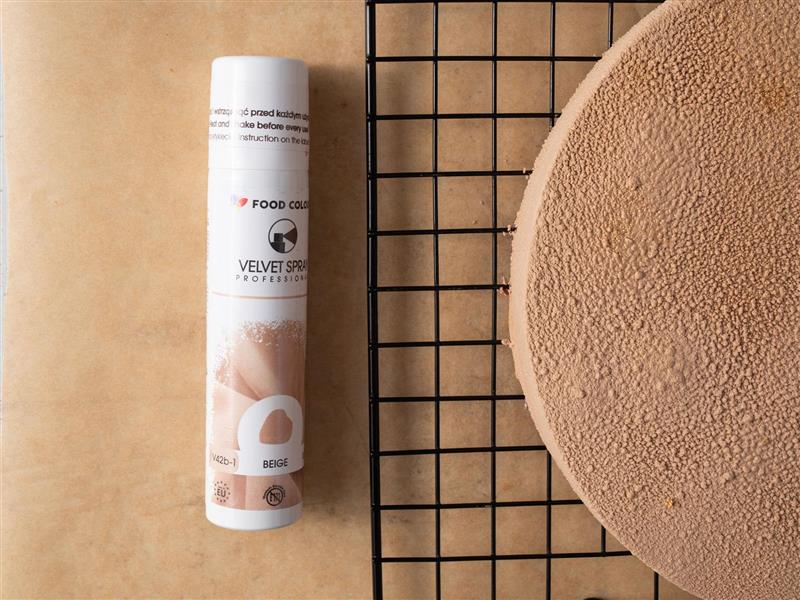 Wstrząśnij kilkukrotnie puszką z zamszem i rozprowadź równomiernie na całej powierzchni tortu z odległości około 25 cm.