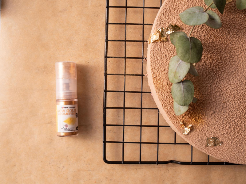 Udekoruj jadalnym złotem i spryskaj złotym pyłkiem. Na bokach tortu ułóż niewielkie gałązki eukaliptusa.