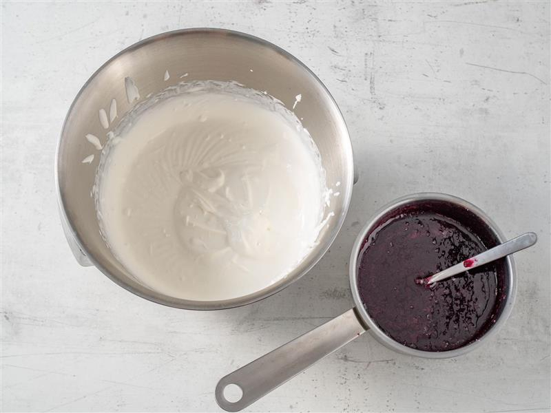 Jagody zagotuj z cukrem i sokiem z cytryny, zblenduj na gładką masę. Dodaj napęczniałą żelatynę i dokładnie wymieszaj. Odstaw do wystudzenia.