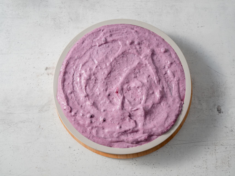 Na żelkę wylej mus jagodowy, zostawiając około 1 cm. Wyłóż spód brownie, lekko dociskając. Wypełnij formę resztą musu jagodowego i wygładź szpatułką.
