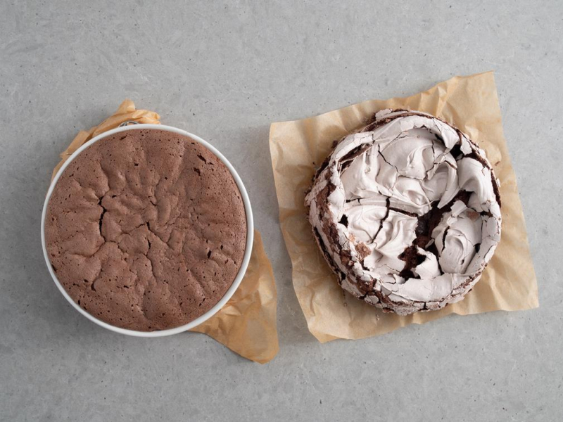 Upieczoną bezę pozostaw do wystudzenia. Biszkopt przekrój na 2 blaty.