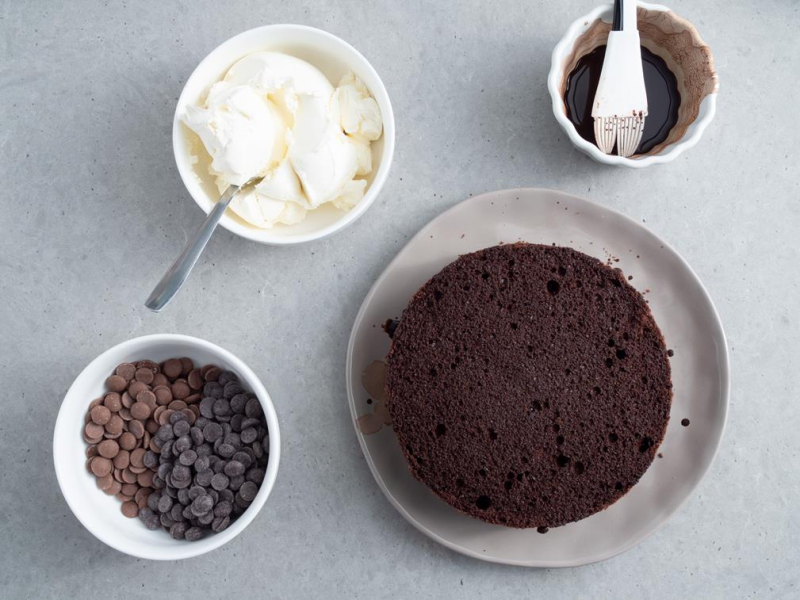 Wszystkie składniki na krem zmiksuj i przełóż do worka cukierniczego. Nasącz dolny blat biszkoptowy.