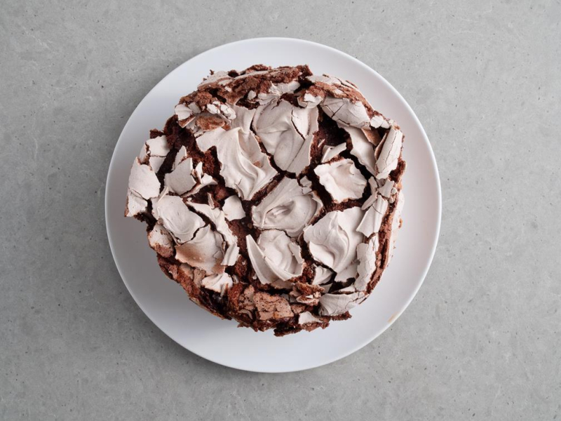 Ciemny biszkopt przełożony kremem czekoladowym i masą z pastą migdałową, a to wszystko zwieńczone bezową koroną z dodatkiem kakao🍫🍫🍫 Prawdziwa uczta dla wielbicie intensywnych, czekoladowych smaków!