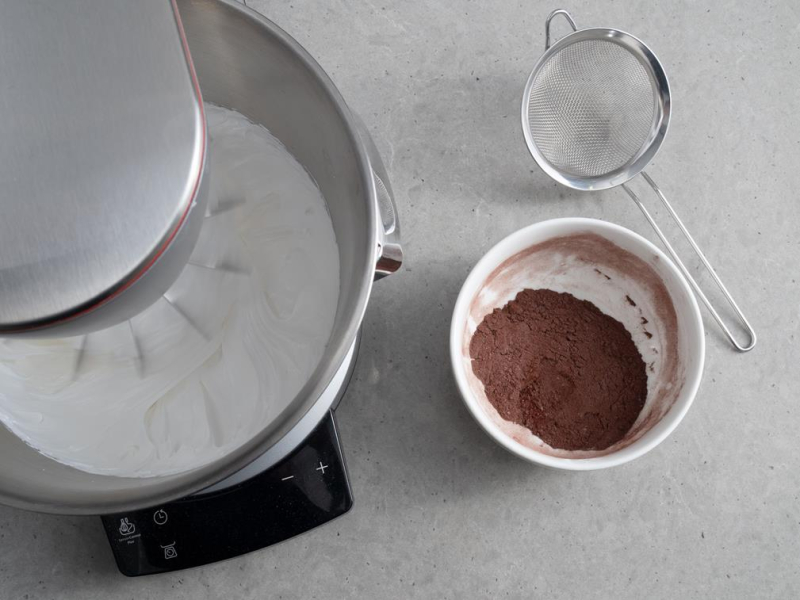 Białka z cukrem ubij na sztywną pianę, ubijaj do całkowitego rozpuszczenia się cukru. Mąkę przesiej z kakao i dodaj do ubitej bezy. Zmiksuj krótko do jednolitej konsystencji.