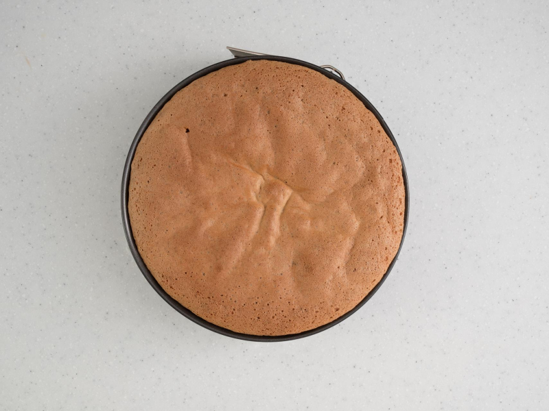 Masę na biszkopt przelej do tortownicy 24 cm, z dnem wyłożonym papierem do pieczenia. Piecz około 40 minut, do suchego patyczka w temperaturze 170°C.