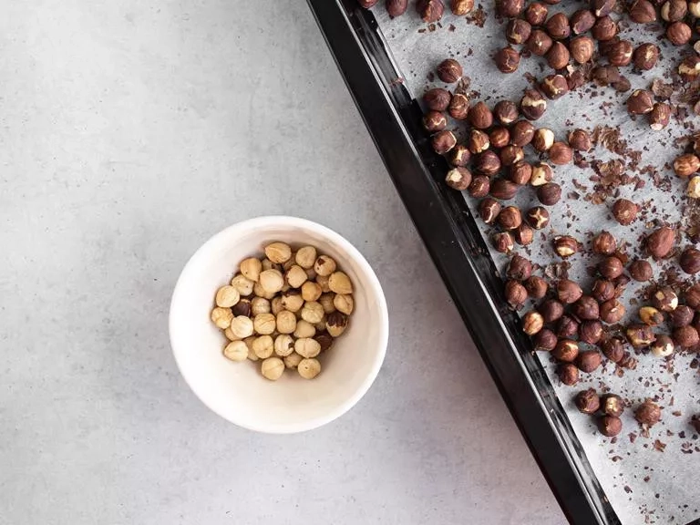 Co daje prażenie orzechów? Nie tylko pozwala na łatwe pozbycie się skórki, która czasami ma lekko gorzkawy smak. Prażenie uwalnia także intensywny smak orzechów, nadaje złocisty kolor i jeszcze bardziej chrupiącą strukturę. Około 15 minut na blaszce w piekarniku rozgrzanym do 120-140°C wystarczy, aby były idealne! Orzechy możesz także prażyć na suchej, rozgrzanej patelni. Warto kontrolować proces prażenia, aby nie przypalić orzechów, a jedynie je zarumienić.