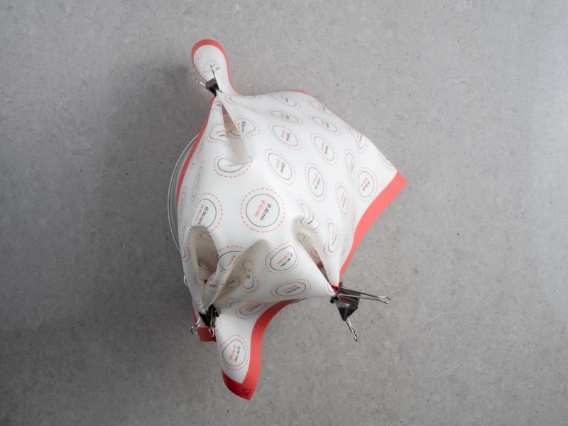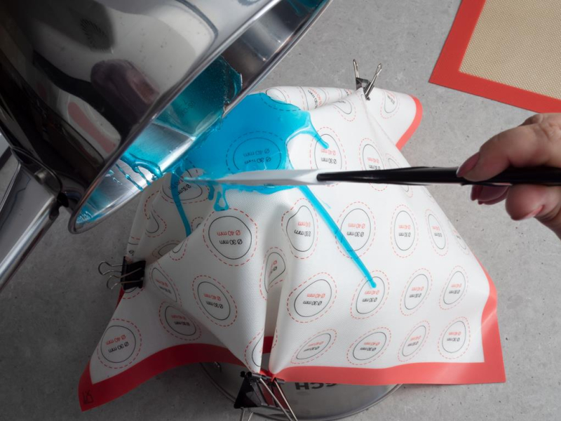 Matę silikonową (najlepiej cienką i elastyczną) umieść na butelce, puszce lub odwróconej dnem do góry miseczce. Pospinaj ją w kilku miejscach spinaczami lub klamerkami, żeby isomalt swobodnie spływał tworząc sople.