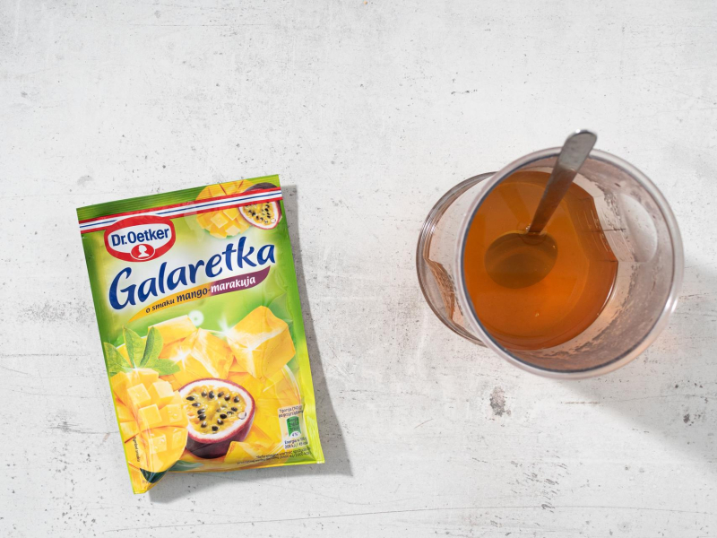 Galaretkę dokładnie rozpuść w 400 ml wrzątku i odstaw do przestudzenia.