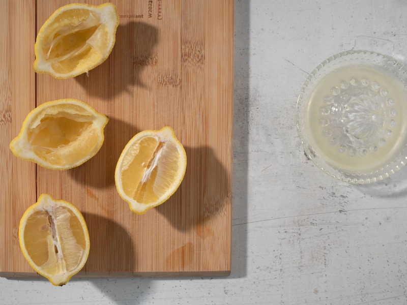 Cytryny przetnij wzdłuż na połówki, wyciśnij sok (możesz go zlać do słoiczka i wykorzystać do czegoś innego).