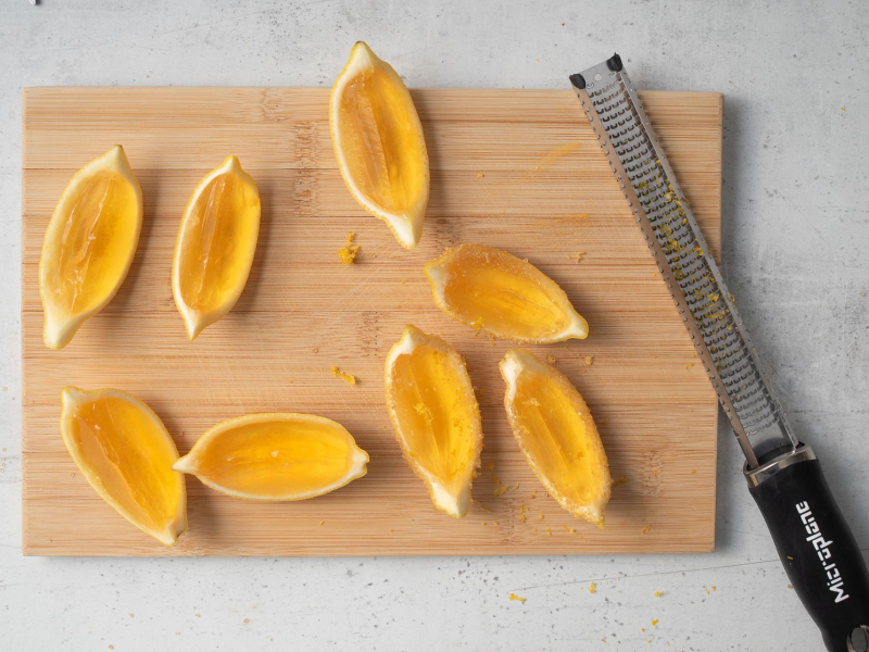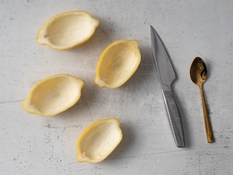 Łyżeczką i ostrym nożykiem pozbądź się resztek miąższu i skórek wewnątrz cytryn. Bardzo dobrze sprawdza się też tutaj łyżeczka do melona lub grapefruita.