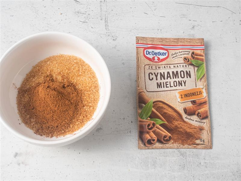 W miseczce wymieszaj cynamon z cukrem trzcinowym.