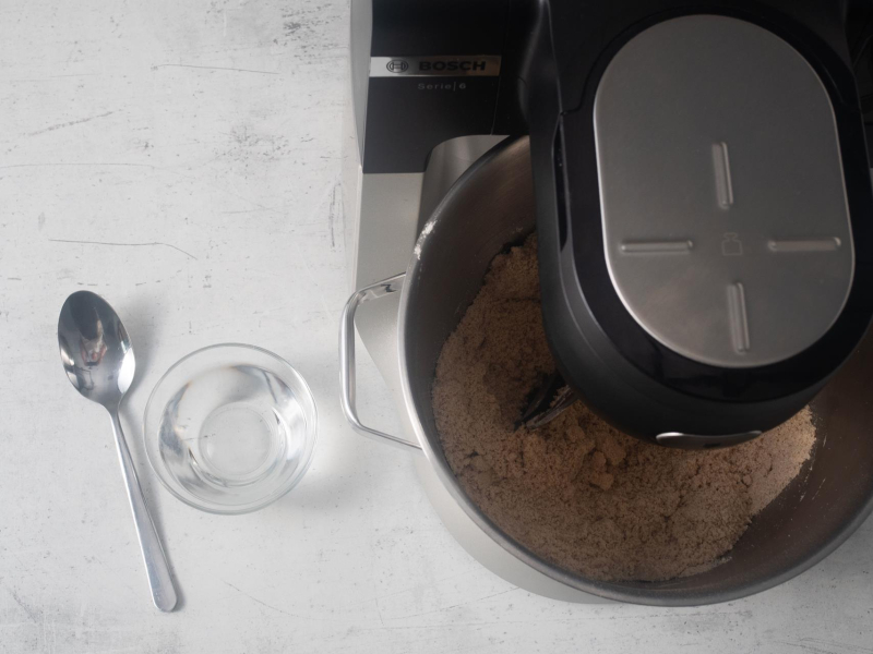 Stopniowo dolewaj wodę, łyżka po łyżce, aż składniki połączą się w kulę ciasta.