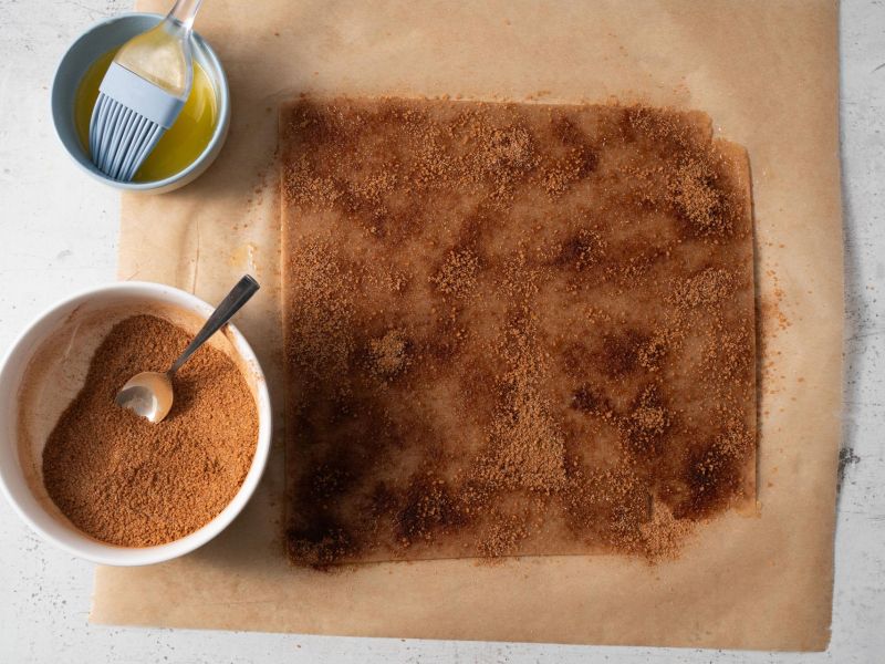 Cukier z cynamonem wymieszaj z roztopionym masłem. Ciasto posmaruj cynamonową masą.