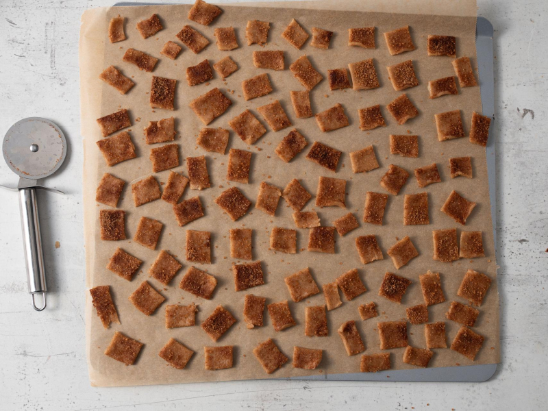 Za pomocą radełka lub ostrego noża potnij ciasto na niewielkie kwadraciki/prostokąty. Przełóż je na blaszkę wyłożoną papierem do pieczenia.