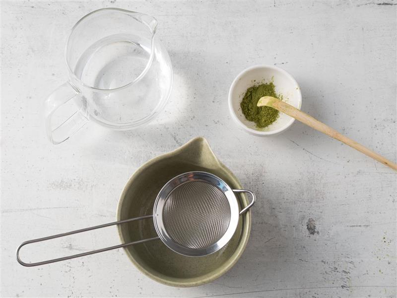 Matchę odmierz i przesiej do miseczki, żeby uniknąć grudek. Zalej gorącą wodą.
